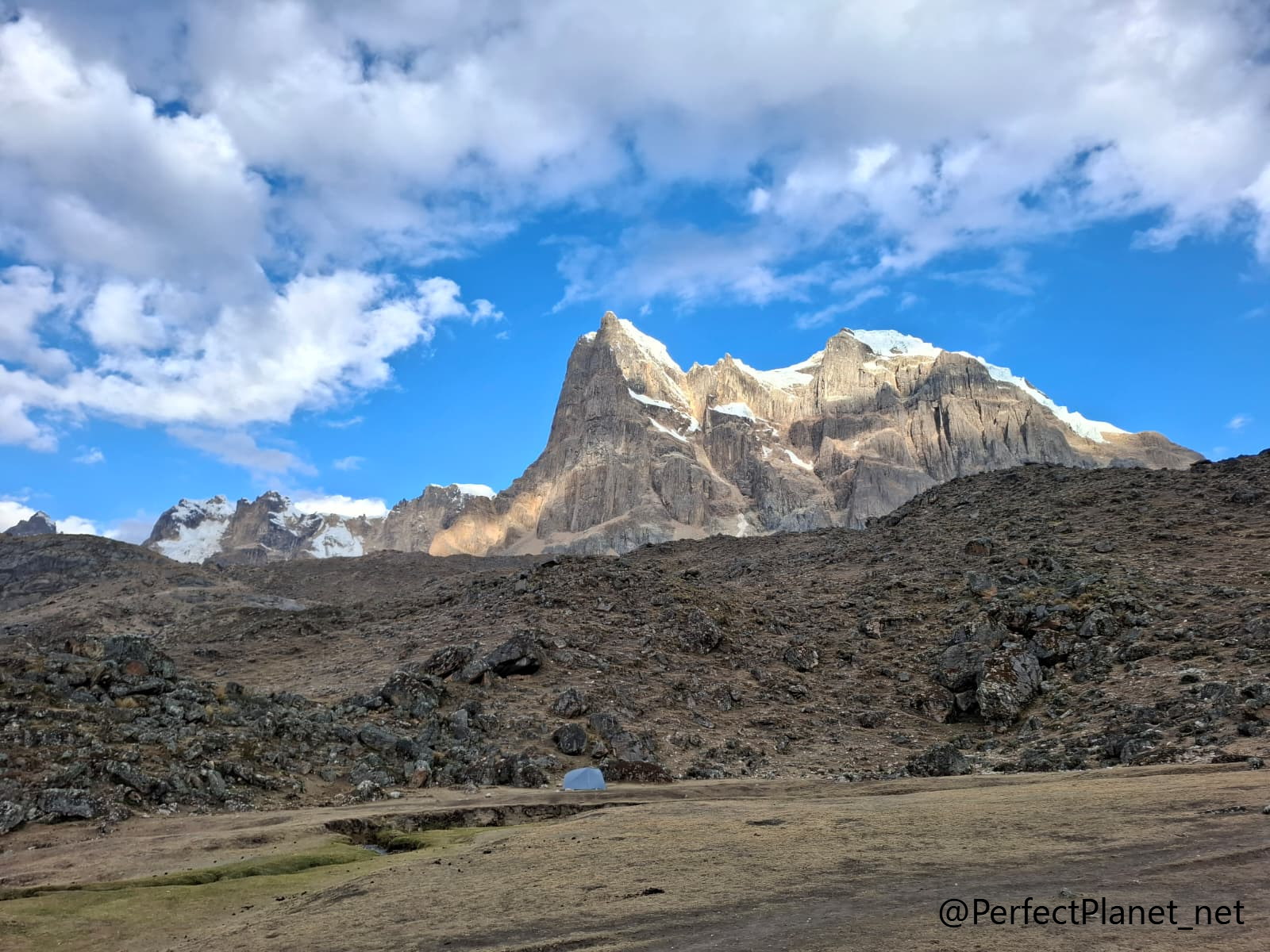 Fourth stage of the Huayhuash trek, sunny dawn, the mountains look impressive!