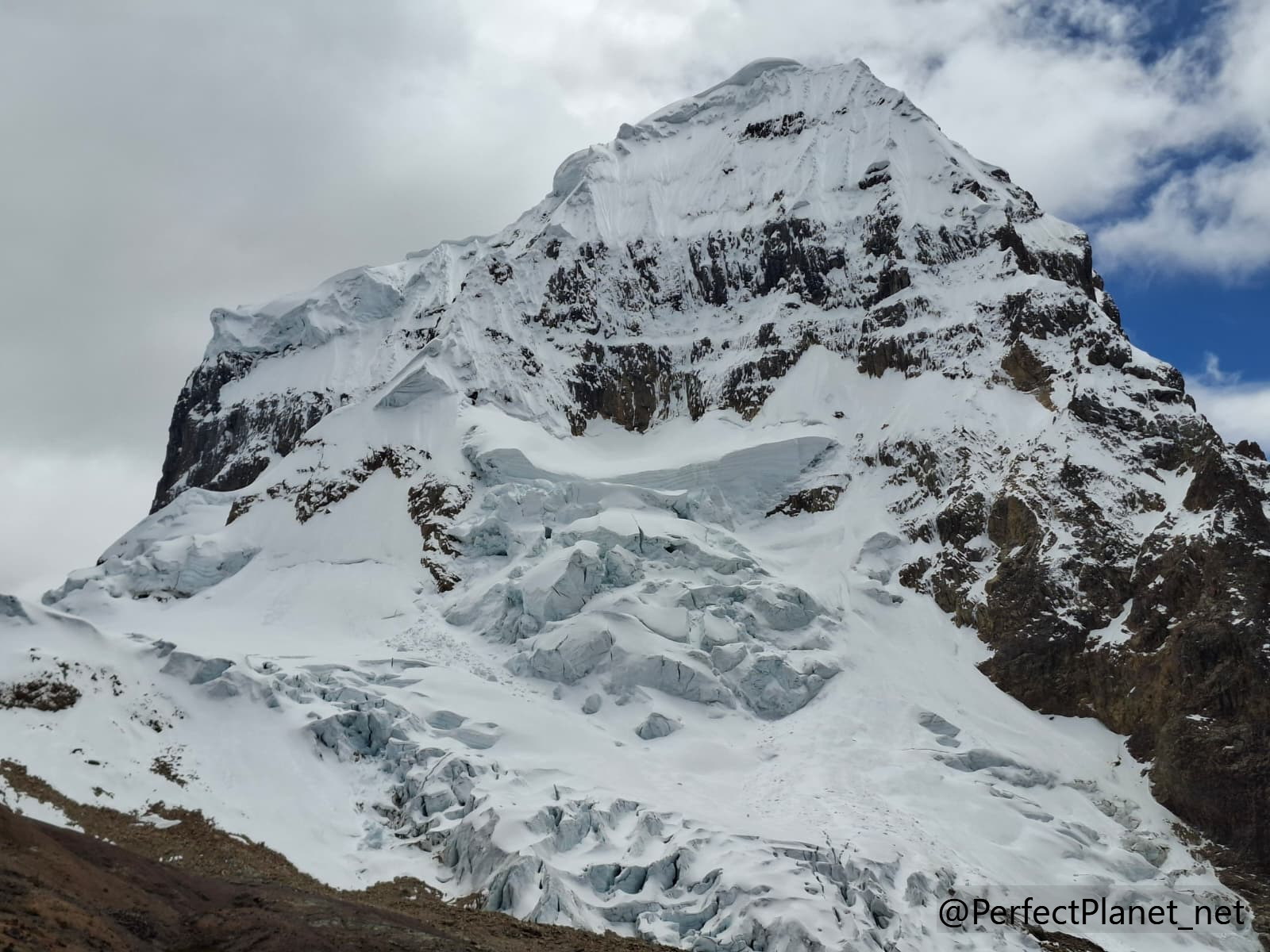 We stop at an area of lagoons where the snow-capped mountain looks incredible. We continue until we reach the pass. Once there, we leave our backpacks and climb up to the viewpoint at 5,150 metres. The views of the glacier and the snow-capped mountain are IMPRESSIVE. This is probably the most spectacular day of the trip.